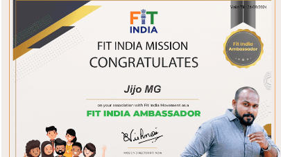 On August 31, 2023, Dr. Jijo MG was officially honored as a Fit India Ambassador by the FIT India Movement, Government of India, in recognition of his efforts in promoting fitness, health awareness, and an active lifestyle across communities.